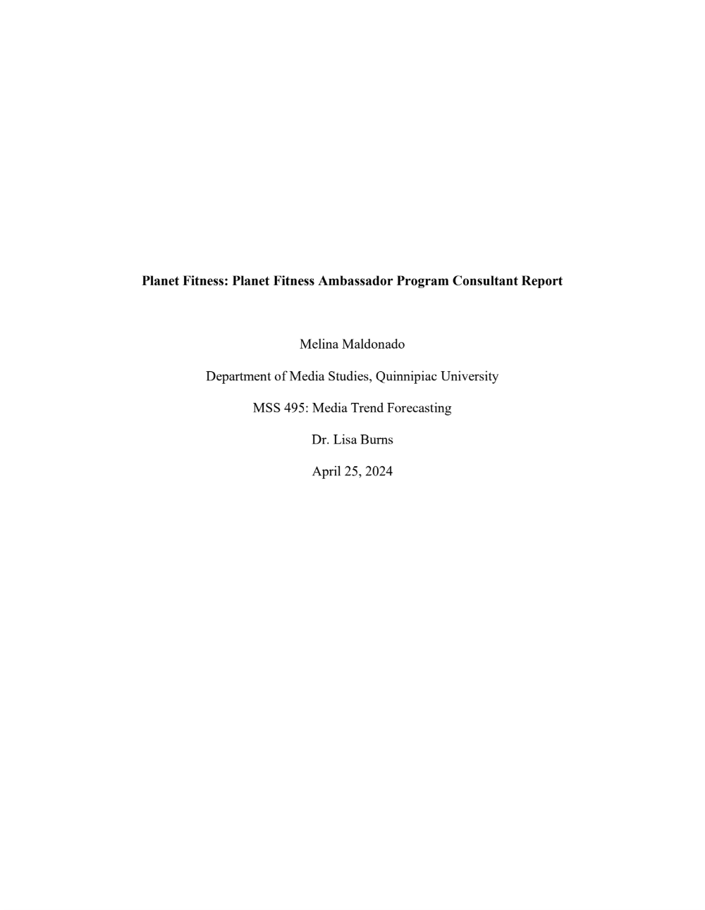 My capstone course to graduate with a degree in Media Studies was called “Media Trend Forecasting”. Our final capstone project was to find a company that has been having a media issue and plan out a proposal to tackle that issue. I picked Planet Fitness based on its public perception of being a beginner-only gym. Through this process, I created a report that tied everything together.