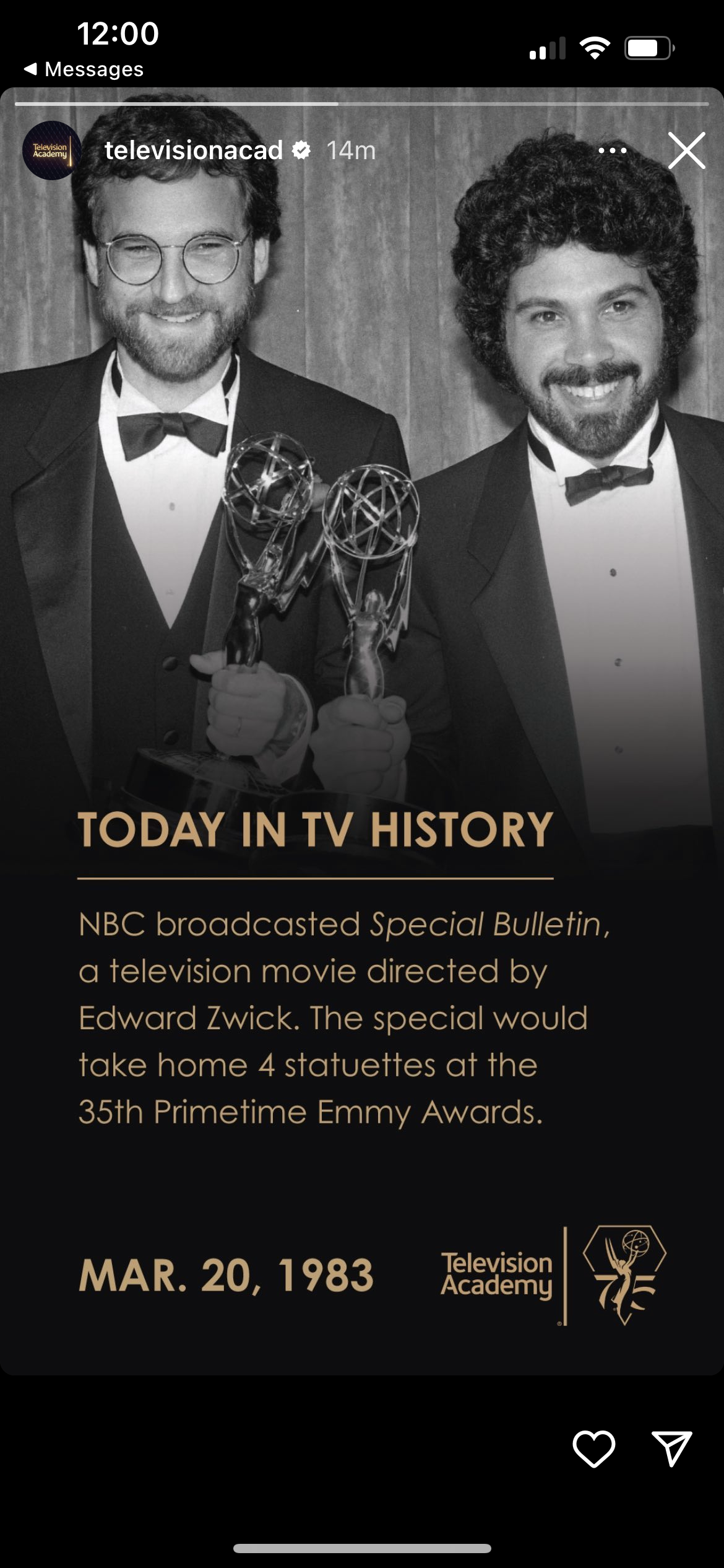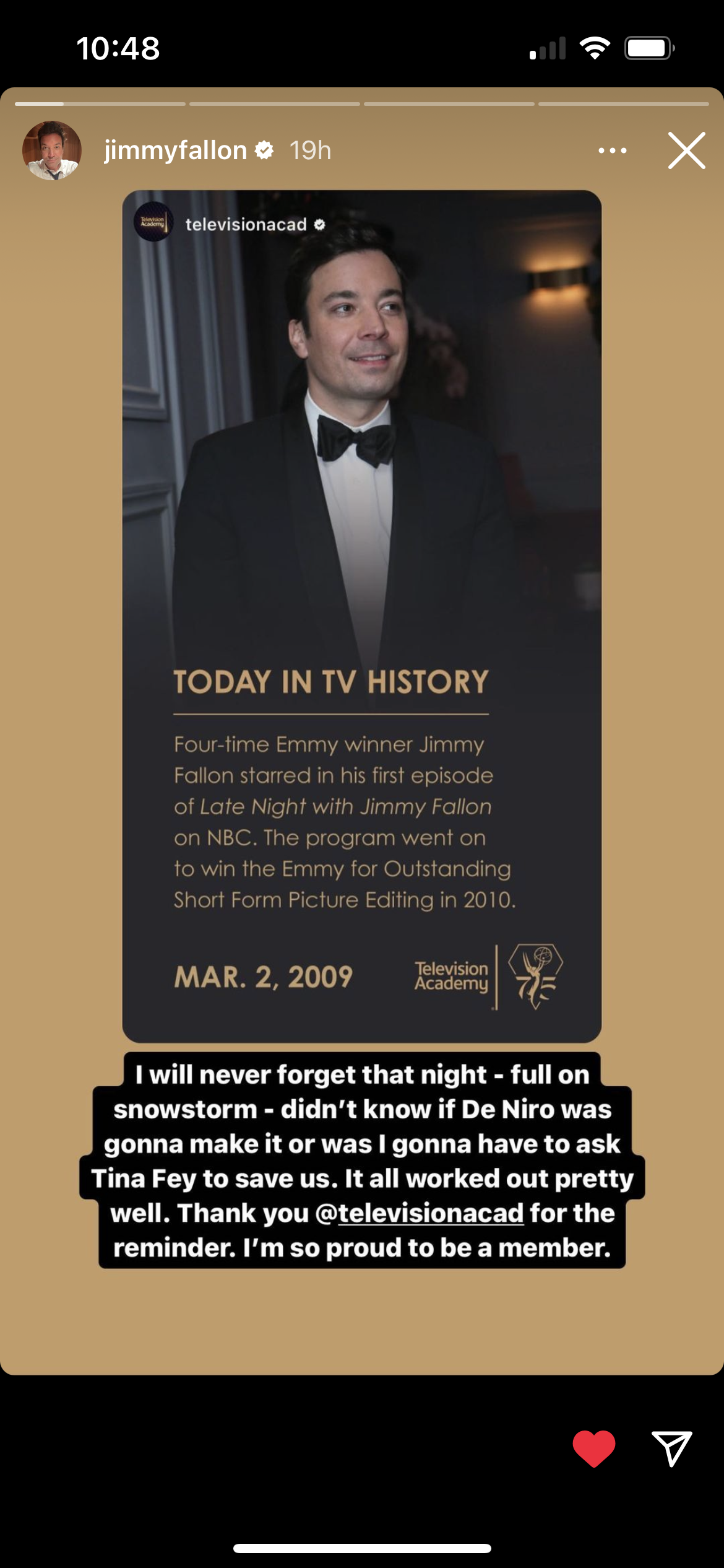 One of the many campaigns the Television Academy created for Instagram was called “Today in TV History”. My assignment for this campaign was to research fun facts relating to Emmy-awarded/nominated shows and actors. Once the fact was approved, I dug through our digital asset management (DAM) system for photo content that could be used. Once the photo was approved, I created an Instagram story graphic with the photo and the fact with Adobe Illustrator. Attached below are the stories I created, along with Jimmy Fallon reposting one of my graphics to his story.